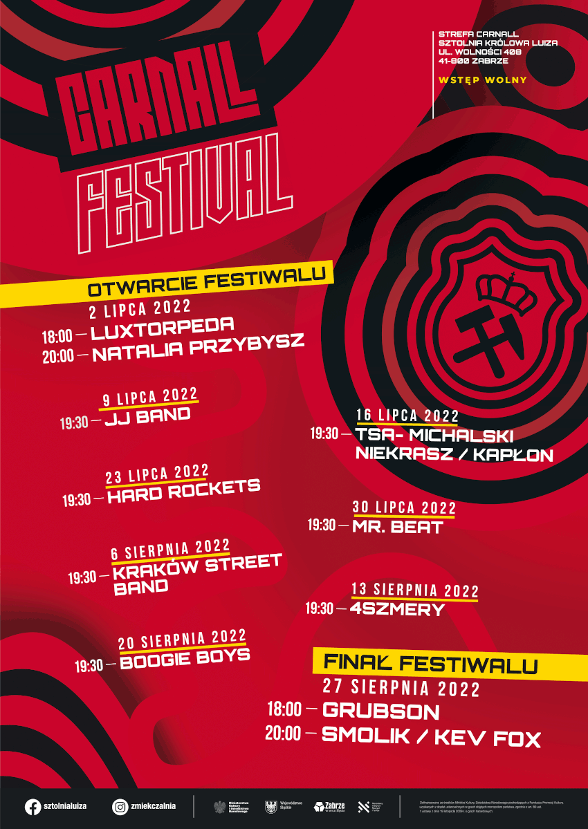 Finałowy koncert tegorocznej edycji Carnall Festivalu zaplanowano na 27 sierpnia. O godz. 18.00 wystąpi GRUBSON, a o godz. 20.00 SMOLIK/ KEV FOX.