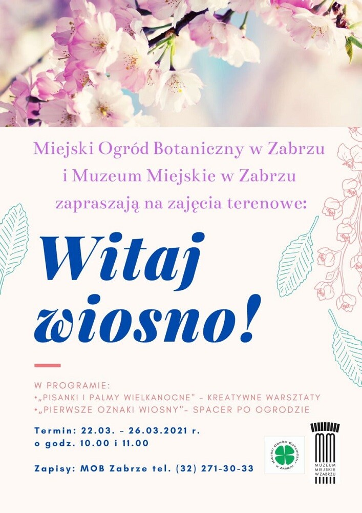 Miejski Ogród Botaniczny w Zabrzu wraz z Muzeum Miejskim w Zabrzu zapraszają przedszkolaków oraz uczniów klas 1-3 szkół podstawowych na zajęcia terenowe w Ogrodzie pn. “Witaj wiosno”.