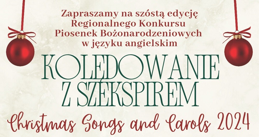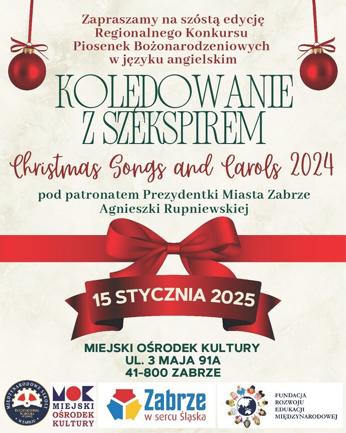 Miłośnicy świątecznej muzyki i języka angielskiego mają kolejną okazję do zaprezentowania swoich talentów! Regionalny Konkurs Piosenek Bożonarodzeniowych w języku angielskim odbędzie się już po raz szósty pod hasłem „Kolędowanie z Szekspirem”. Konkurs, objęty patronatem Prezydentki Miasta Zabrze, Pani Agnieszki Rupniewskiej, skierowany jest do solistów i zespołów z przedszkoli, szkół podstawowych i ponadpodstawowych.