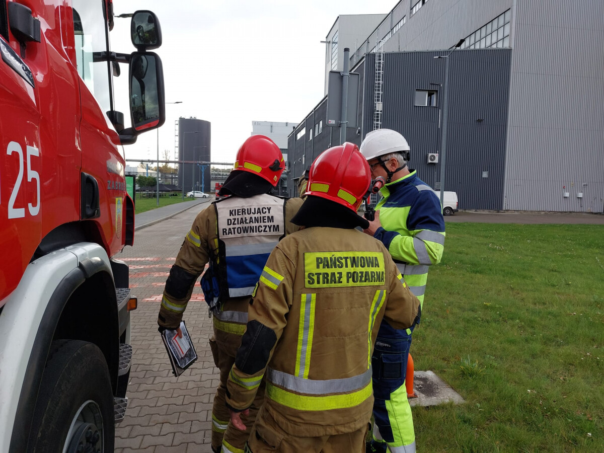W trakcie ćwiczeń zastępy JRG przeprowadziły również rozpoznanie zakładu pod kątem zaopatrzenia w wodę do celów przeciwpożarowych do zewnętrznego gaszenia pożaru oraz dróg pożarowych.