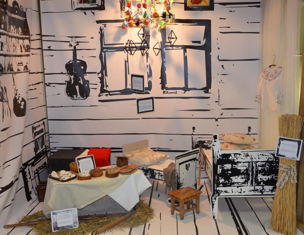 Szopka powstała w szkolnej pracowni rzeźby. Swoją formą nawiązuje do tradycyjnej izby ze świątecznymi potrawami i ozdobami.