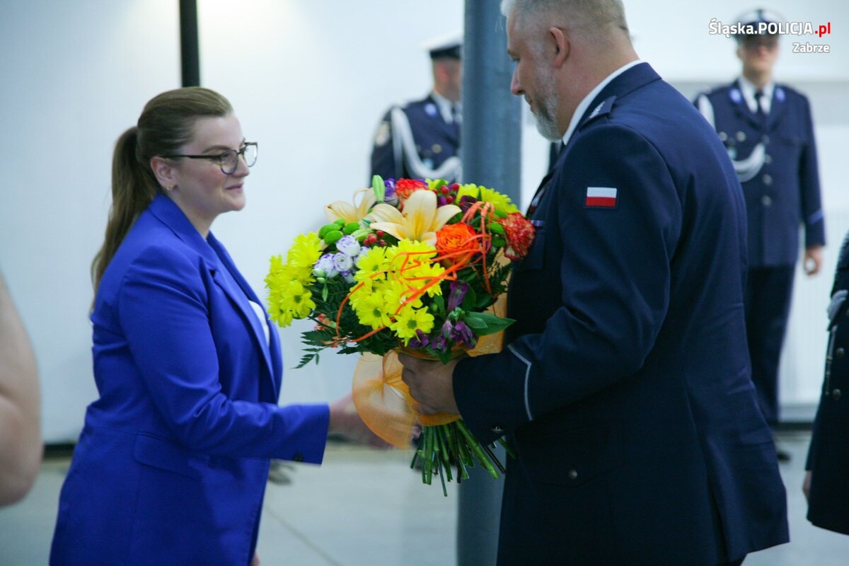 Następnie głos zabrała Prezydent Zabrza Agnieszka Rupniewska i Przewodniczący Rady Miejskiej w Zabrzu Grzegorz Olejniczak, dziękując policjantom za codzienną służbę którą pełnią zabrzańscy policjanci.