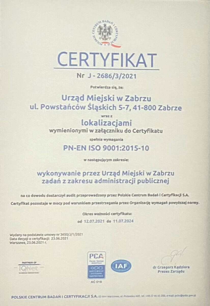 Od 2008 roku nieprzerwanie Urząd Miejski w Zabrzu posiada certyfikat Systemu Zarządzania Jakością ISO 9001.