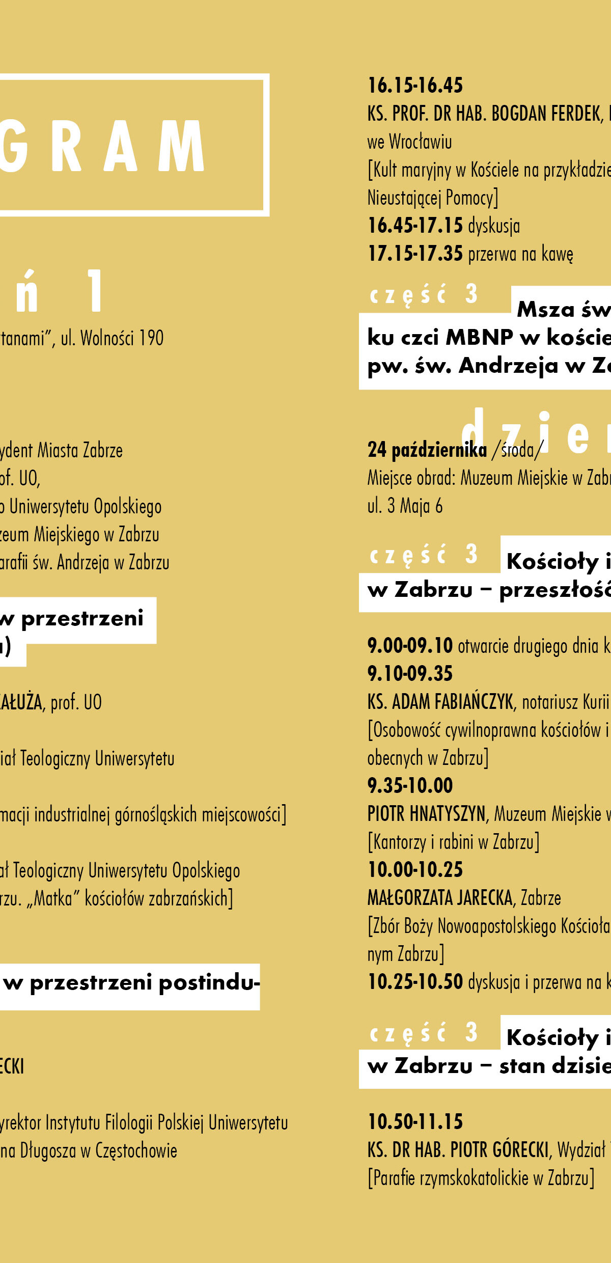 Szczegółowy program IX Konferencji Naukowej Muzeum Miejskiego w Zabrzu - „Sacrum w przestrzeni miasta" w załączeniu, a także na www.muzeum-miejskie-zabrze.pl oraz www.andrzej.zabrze.pl .