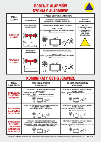 Trening odbędzie się z użyciem syren wydających dźwięk modulowany trwający trzy minuty jako ogłoszenie alarmu i następujący po nim dźwięk ciągły trwający trzy minuty, który oznacza odwołanie alarmu.
