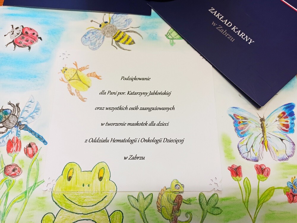 Niestety, z uwagi na ograniczenia związane z pandemią i bezpieczeństwo małych pacjentów, funkcjonariusze z Zakładu Karnego w Zabrzu nie mogli wejść na oddział i osobiście wręczyć im prezentów. Świąteczne upominki przekazali na ręce pani Elżbiety Dziubek i Anny Strzeleckiej - oddziałowej Oddziału Hematologii i Onkologii dziecięcej w Zabrzu. Funkcjonariusze zadbali, aby wszystkie prezenty zostały zdezynfekowane i spakowane z zachowaniem reżimu sanitarnego, aby dzieci mogły się nimi bezpiecznie bawić. Maluchy z niecierpliwością czekały na maskotki i poduszki. Własnoręcznie przygotowały piękne podziękowania.