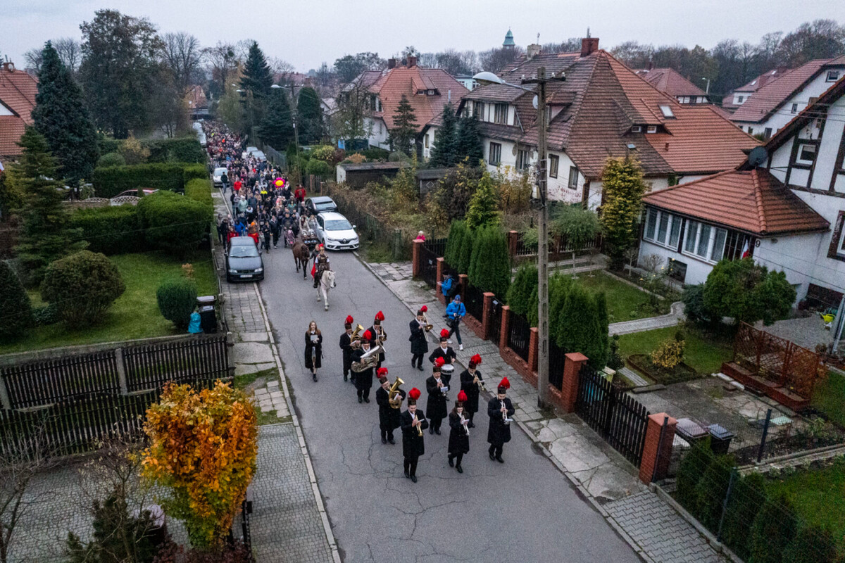 Barwny pochód, jak każe tradycja ze św. Marcinem na białym koniu na czele, wyruszył sprzed siedziby Szkoły Podstawowej nr 29. Przy dźwiękach orkiestry górniczej przeszedł rokitnickimi ulicami Kosmowskiej, Makuszyńskiego, Roweckiego i Andersa, wkraczając na teren Sanktuarium Szensztackiego.