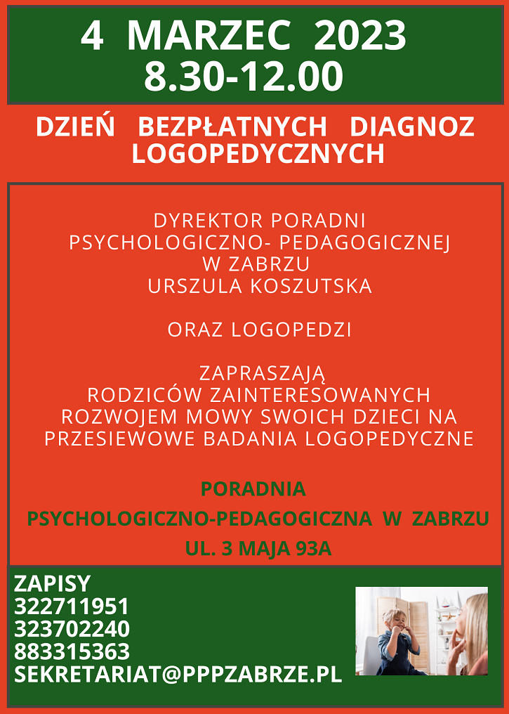 Logopedzi Poradni Psychologiczno-Pedagogicznej w Zabrzu zapraszają na Dzień Bezpłatnych Diagnoz Logopedycznych, który odbędzie się w sobotę 4 marca, w godzinach od 8:30 do 12:00 w siedzibie poradni w Zabrzu przy ul. 3 Maja 93a.