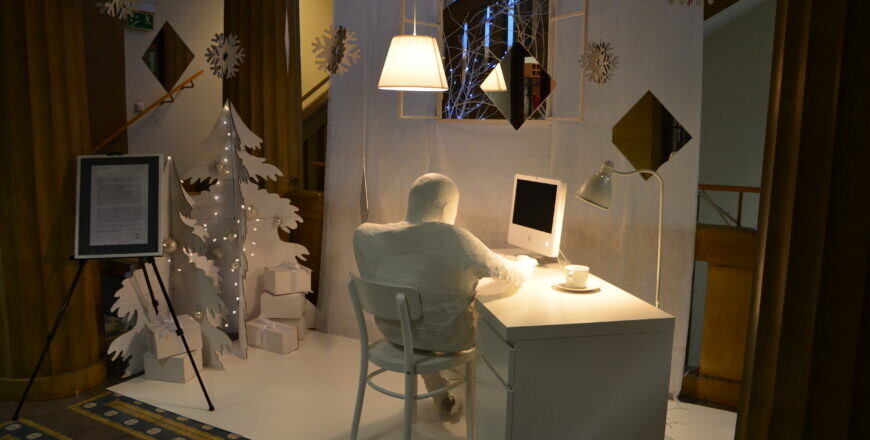 Tegoroczna szopka obrazuje sytuację, w której każdy z nas odnaleźć może własne doświadczenia. Pandemia koronawirusa wpłynęła na życie ludzi na całym świecie. Prezentowana instalacja pokazuje białą, sterylną przestrzeń, która przedstawia wnętrze pokoju oraz postać siedzącą przed ekranem komputera. To bardzo częsty widok w ostatnich dniach, a nawet miesiącach. Większość stałych elementów naszego życie przeniosła się do sieci, spędzamy bardzo dużo czasu przed ekranami komputerów, biorąc udział w zajęciach szkolnych, szkoleniach, konferencjach, pracując czy szukając rozrywki.