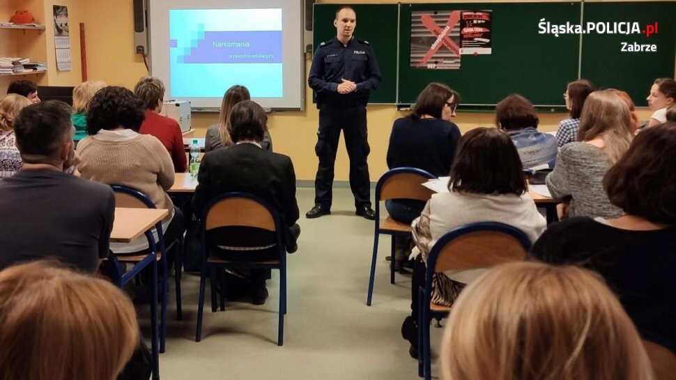 Policjanci Zespołu ds. Profilaktyki Społecznej zabrzańskiej komendy cyklicznie przeprowadzają takie spotkania, podczas których omawiają zagrożenia związane z sytuacjami gdy młode osoby sięgają po narkotyki czy dopalacze. Policjanci przeprowadzają takie spotkania nie tylko z młodzieżą, ale również z osobami, które mają olbrzymi wpływ na edukację naszych pociech. Wczoraj w Zespole Szkół Katolickich w Zabrzu, nauczyciele mieli okazję dowiedzieć się, na co zwrócić szczególną uwagę w zachowaniu dzieci i młodzieży, jakie są sygnały ostrzegawcze wskazujące na to, że młoda osoba może sięgać po narkotyki czy dopalacze, a także jak wygląda kwestia odpowiedzialności prawnej nieletnich.