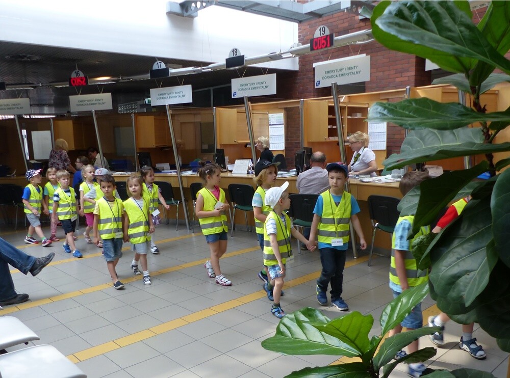 4 czerwca był wyjątkowym dniem w zabrzańskim ZUS. Placówkę odwiedziły dzieci z Przedszkola nr 43, z grupy Niedźwiadków. Już od pierwszych sekund w ZUS zrobiło się wyjątkowo. W holu pobrzmiewało głośne „Dzieeeń dooobbrryyy” i takie natężenie decybeli było już do końca wizyty. Bo przedszkolaki zaciekawione były wszystkimi i wszystkim. Co rusz dopytywali o nowe rzeczy, każdą maszynę czy urządzenie chcieli dotknąć i sprawdzić. Oczywiście, jak prawdziwi goście, otrzymali stosowne plakietki GOŚĆ ZUS-u, dzięki którym zostali „upoważnieni” do poruszania się po siedzibie Oddziału. Nie obyło się bez załatwienia spraw w urzędzie. W końcu każde z dzieci miało swój osobisty interes, aby emerytura babci czy dziadka była wyższa. Dlatego dokumenty ochoczo zaczęli wypisywać, a raczej zamalowywać, bo wiadomo, że obraz znaczy więcej niż tysiąc słów. Zanim jednak zostali obsłużeni pilnowali swojej kolejki i numerów z bilecików jakie pobrali z dyspensera. Po załatwieniu „finansowych” interesów, przeszli do zwiedzania poszczególnych wydziałów i pokoi.