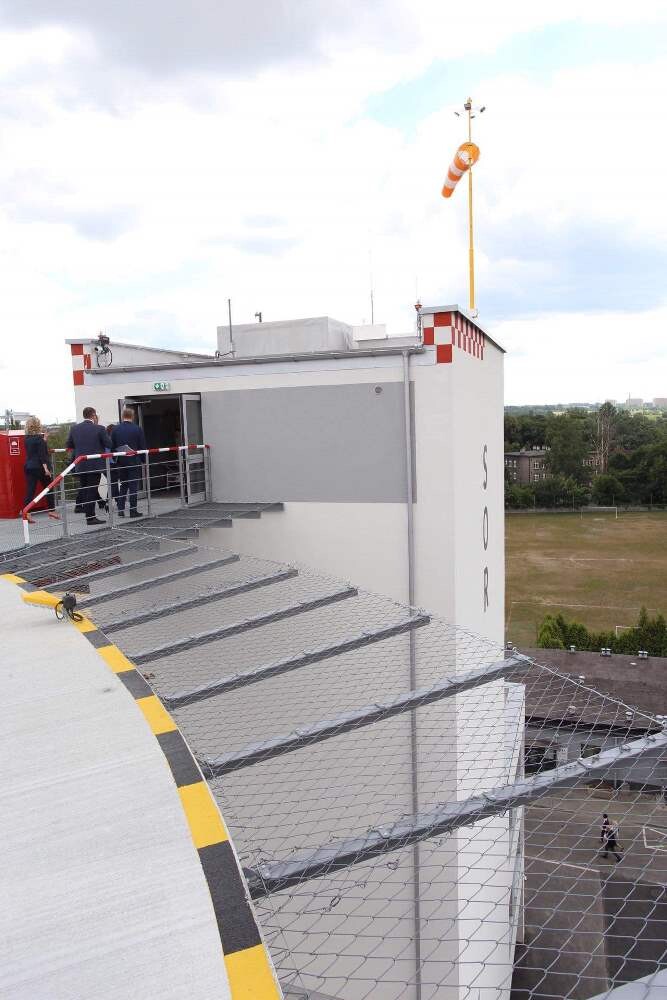 Na dachu budynku zlokalizowane jest lądowisko dla helikopterów