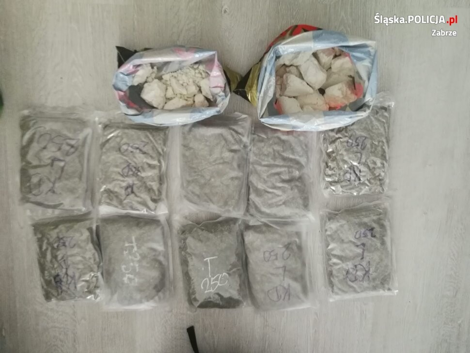 Zabrzańscy kryminalni zajmujący się zwalczaniem przestępczości narkotykowej zatrzymali mężczyznę podejrzanego o posiadanie znacznej ilości narkotyków. 32-latek został zatrzymany w swoim mieszkaniu w Tychach. Mężczyzna był bardzo zaskoczony poranną wizytą policjantów. W trakcie przeszukania mieszkania policjanci ujawnili prawie 2,5 kg marihuany, ponad 4,7 kg „mokrej” amfetaminy i substancję służącą do przygotowania narkotyku na rynek. Z zabezpieczonych środków można wyprodukować ponad 225 tys. działek dilerskich narkotyków. W trakcie policyjnych czynności okazało się, że mężczyzna był poszukiwany dwoma listami gończymi za posiadanie i handel narkotykami. W jego sypialni przy łóżku kryminalni zabezpieczyli pistolet maszynowi i amunicję, a także gotówkę, biżuterię i telefon.
