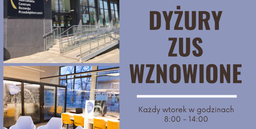 Informujemy, że od 1 czerwca wznowiona zostanie bezpośrednia obsługa klientów przez pracownika Zakładu Ubezpieczeń Społecznych w Zabrzańskim Centrum Rozwoju Przedsiębiorczości.