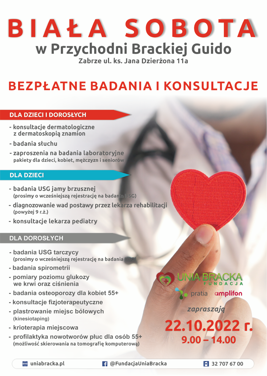 Już w najbliższą sobotę 22 października Przychodnia Bracka Guido zaprasza mieszkańców Zabrza do skorzystania z bezpłatnych badań i konsultacji w ramach akcji Białej Soboty.